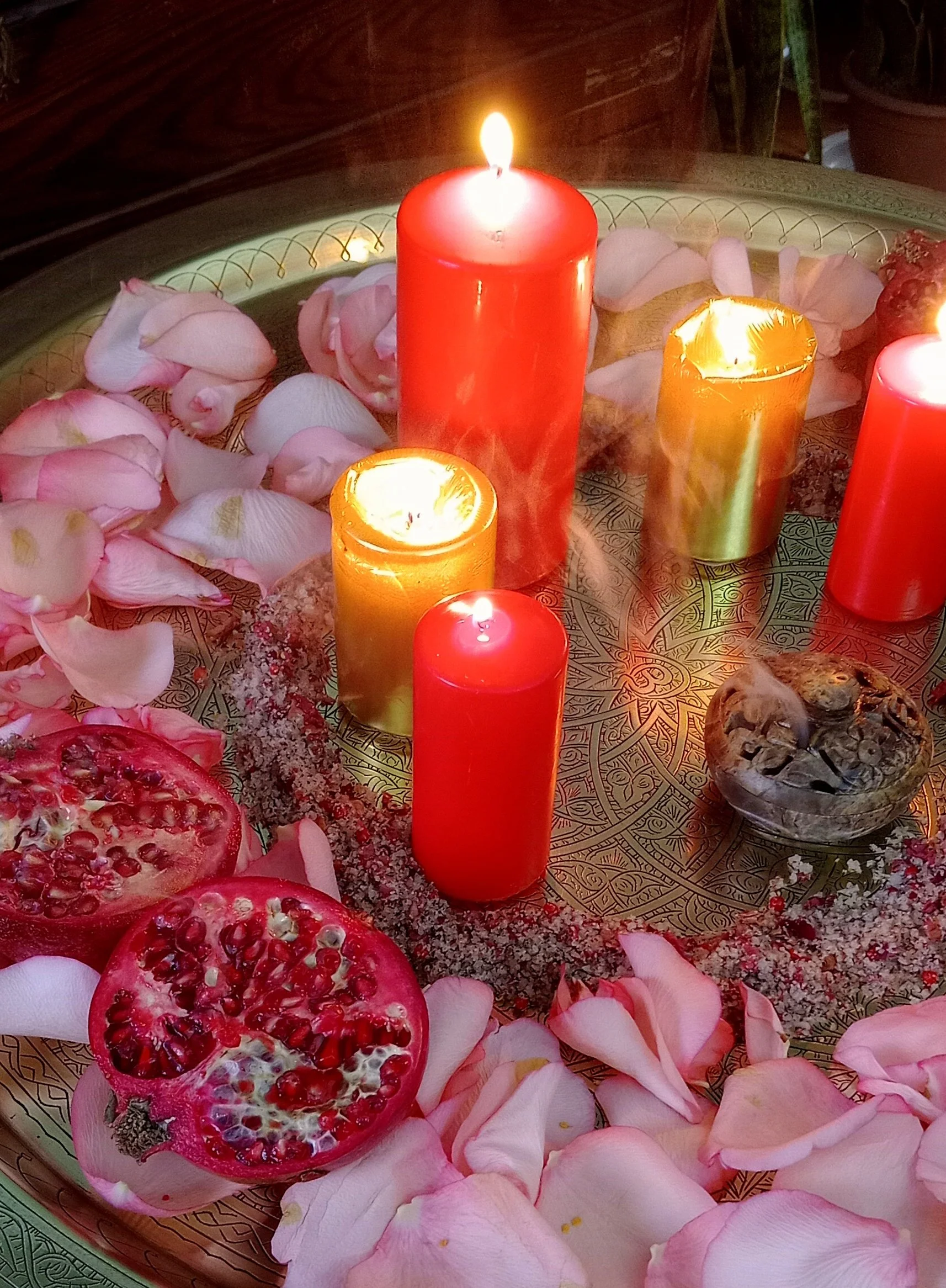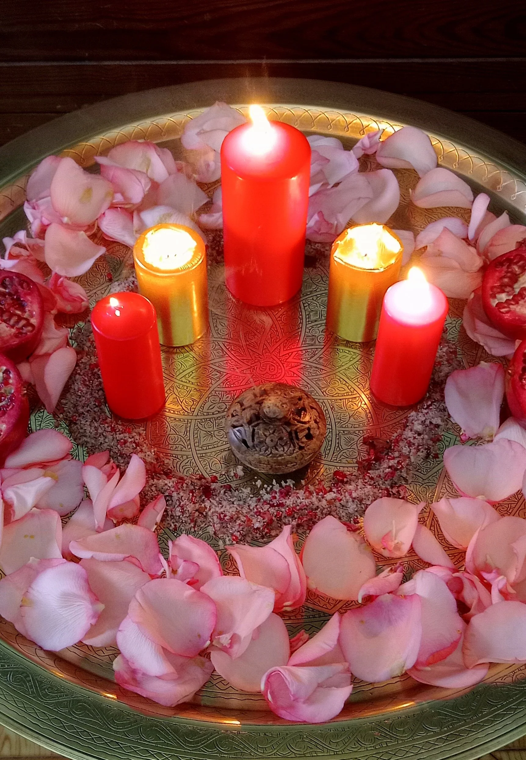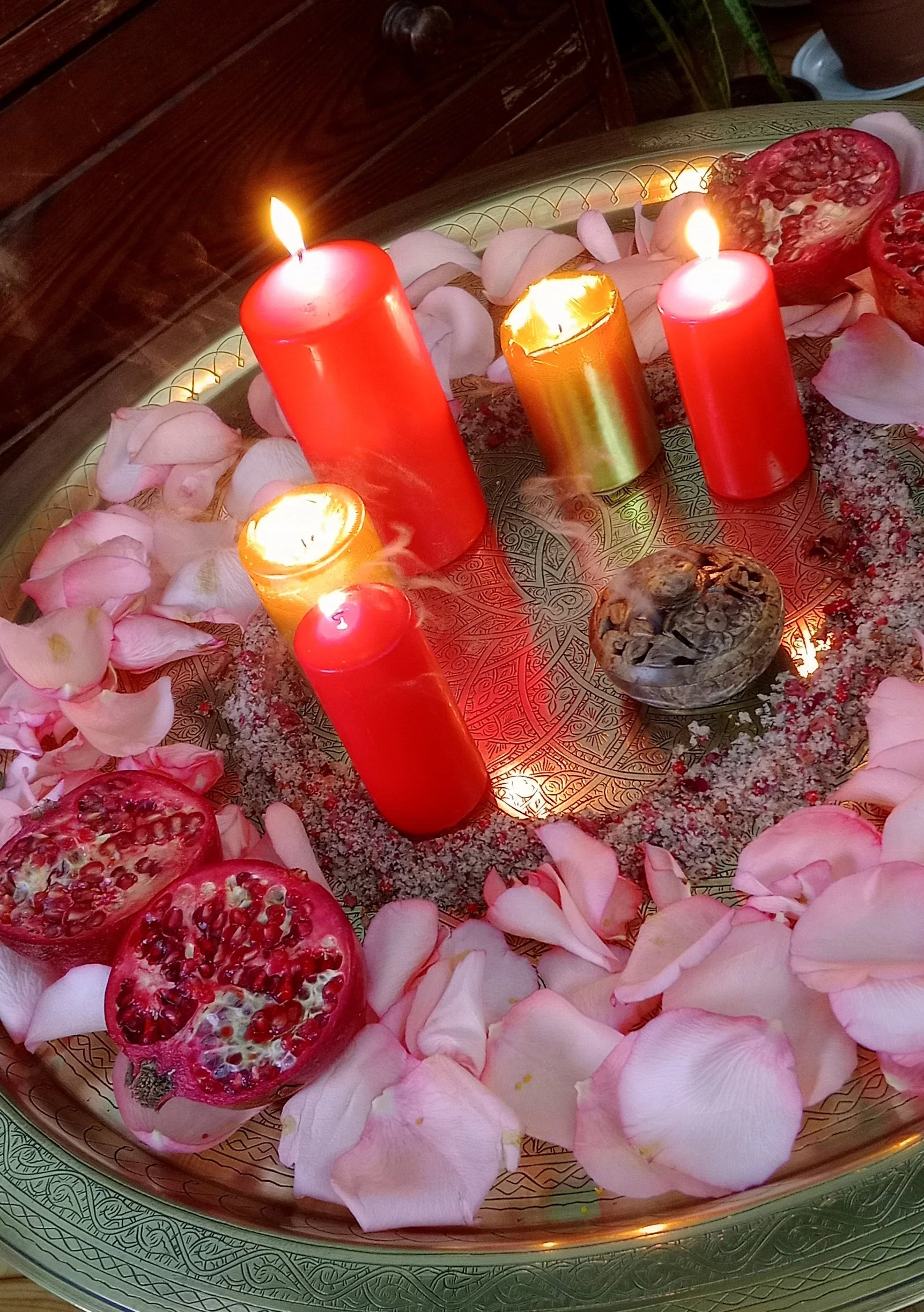 Finally, of course, a ring of pink rose petals was created around the whole table. The rose is the holiest flower in my culture, and the perfect representation of Divine Love and faith. It’s also pomegranate season here, so we added two gorgeous ones to the offering.